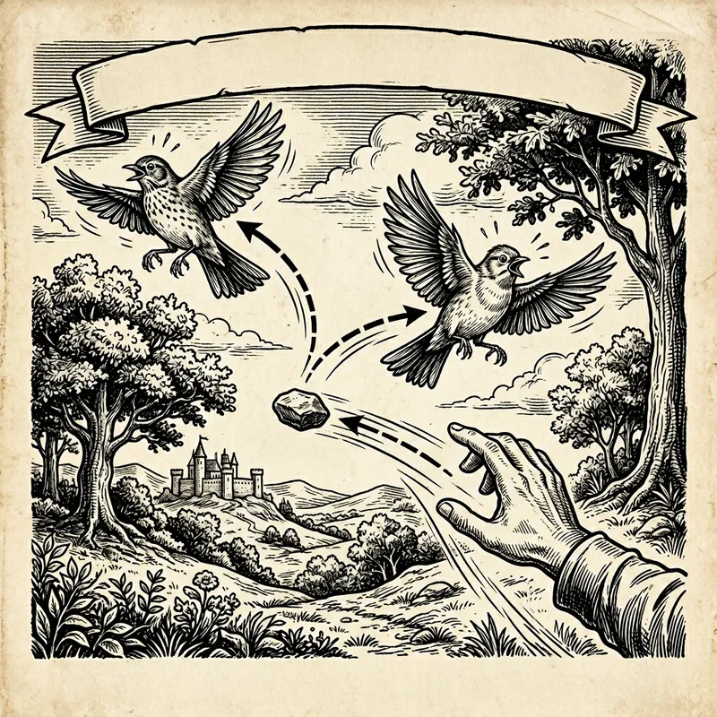 An illustration of the concept 'killing two birds with one stone'. Display a hand expertly throwing a stone in a direction. You can visualize the trajectory of the stone splitting into two paths, each heading towards a bird. The birds are mid-flight, wings spread wide, and they look surprised as the stone paths seem to be heading accurately towards them. Everything is in black and white to give it an ancient proverb illustration feel.
