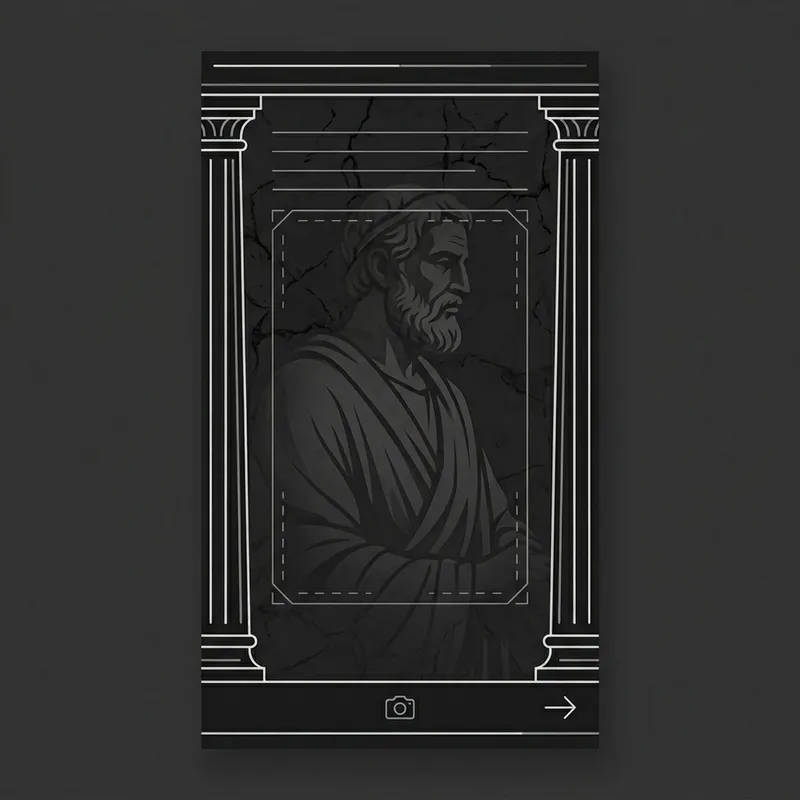 Create a digital art piece that serves as an Instagram story template, steering its theme towards the aesthetics of ancient Rome. Use a monochromatic black color palette. The design should feature a faded black and white silhouette of a generic ancient philosopher placed subtly in the background to lend depth without overpowering the rest of the design. As part of the decor, incorporate Roman pillars, but maintain a minimalistic look. The artwork should be characterized by clean lines, sharp edges, and a clear distinction between the visual elements.