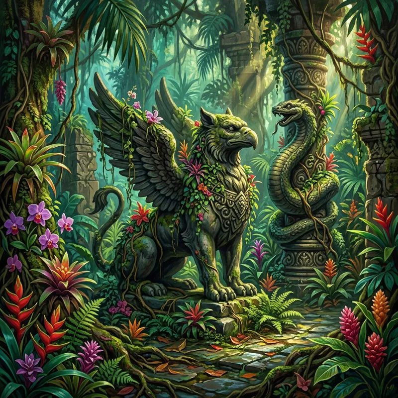 Ancient stone statues of mythical creatures in a lush jungle, overgrown with vines and flowers, styled in vibrant tropical colors, dappled sunlight through the leaves, serene and mysterious atmosphere, intricate details, digital paintings with rich textures, inspired by nature, Victorian style