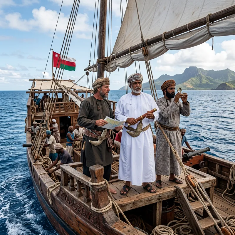 Ancient Warship Crew with Diverse Captains in Omani Attire