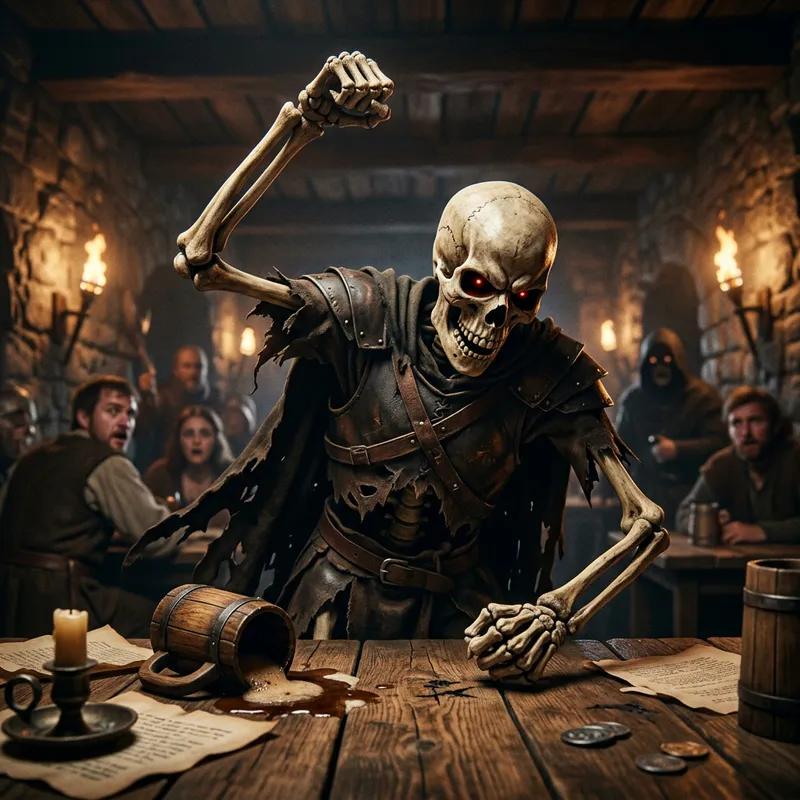 Angered skeleton raising his fist before he slams it back down on a table.