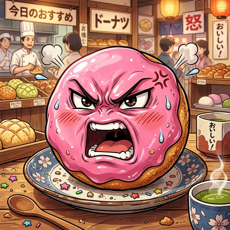 Create a detailed and imaginative image of a donut with a distinct pink glaze. The donut should have expressive human facial features that display an angry emotion. The art style should be consistent with traditional Japanese animations known for their exaggerated features, vibrant colors, and emotional depth.