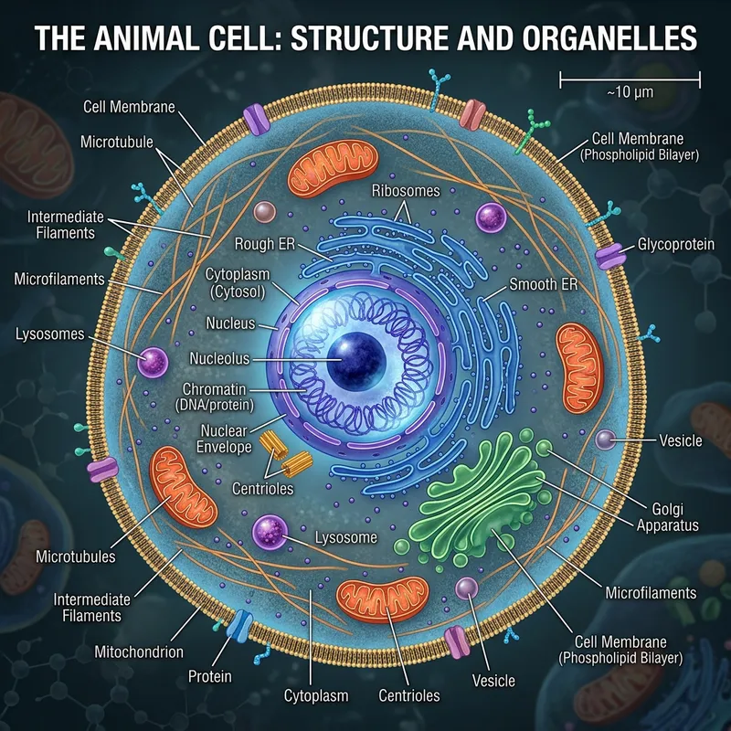 A detailed illustration of an animal cell, showing all the main parts, including the nucleus, cytoplasm, mitochondria, ribosomes, endoplasmic reticulum, Golgi apparatus, lysosomes, and the cell membrane. The nucleus should be centered and highlighted as if under a microscope, containing a nucleolus within. The cytoplasm should be rendered as a semi-transparent substance filling the space between the nucleus and the cell membrane. Mitochondria, ribosomes, endoplasmic reticulum, Golgi apparatus, and lysosomes should be scattered throughout the cytoplasm. The cell membrane, the exterior part of the animal cell, should be depicted as a double-layered structure.