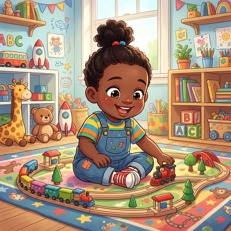 Animated Black Toddler Playing with Toy Train Set