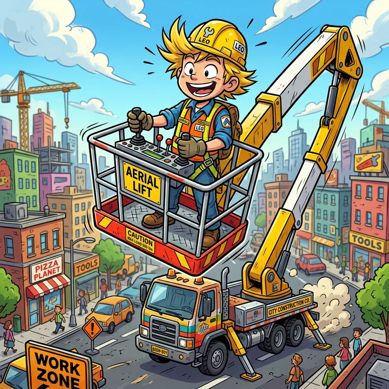 Cartoon Illustration: Boy Operating Aerial Work Platform