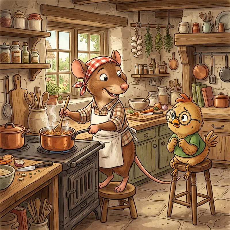 A charming illustration of a culinary rat character, with brown fur, red bandana, and chef's apron, preparing a delicious meal in a rustic country style kitchen. Simultaneously, a small and nervous chicken-like character with round glasses and wearing a green t-shirt is perched on a kitchen stool, observing the cooking process with a combination of apprehension and fascination. The characters both share an animated anthropomorphic style, but they do not reference any specific copyrighted characters.