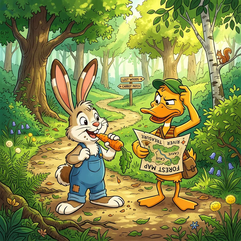 A classic animated cartoon scene featuring a cheerful anthropomorphic rabbit with long ears, a fluffy tail, and its best friend, a sluggish and witty anthropomorphic duck. They are in a verdant forest, with the sun shining brightly above, casting dappled shadows onto the forest floor. Our rabbit friend is munching on a crunchy carrot while the duck is seen with a perplexed look, trying to read a map upside down. Their misadventures and camaraderie never fail to evoke laughter.