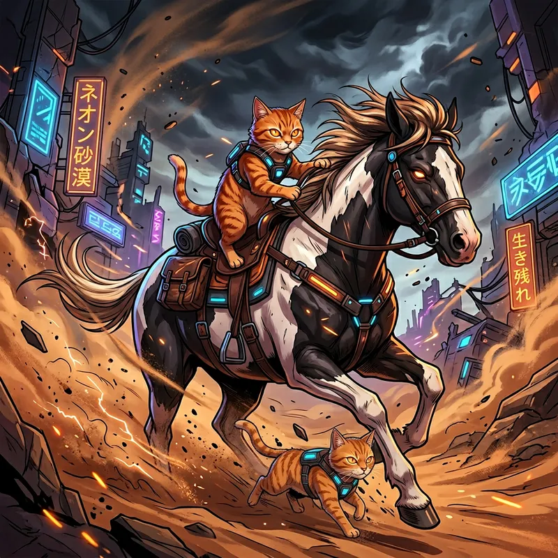 Anime-Inspired Cyberpunk Art: Ginger Cat and Piebald Horse in Sandstorm