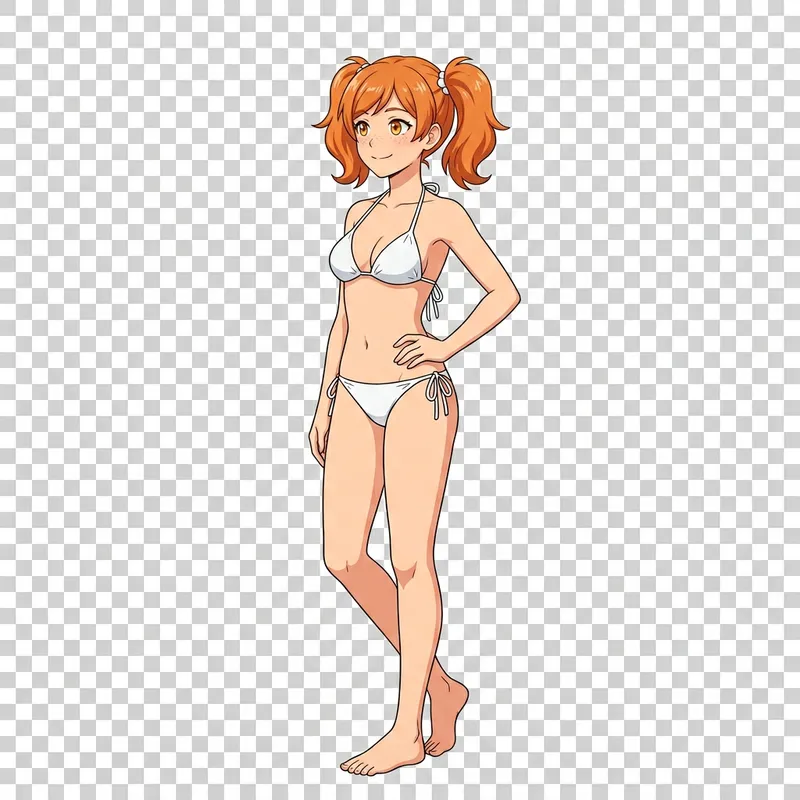 anime game art, standing picture, semi-side view, looking left, young woman, ginger hair in short twintails, light freckles on nose, bright amber eyes, warm smile, white bikini, transparent background, barefoot, flat style, simple lines, full body, slender figure.
