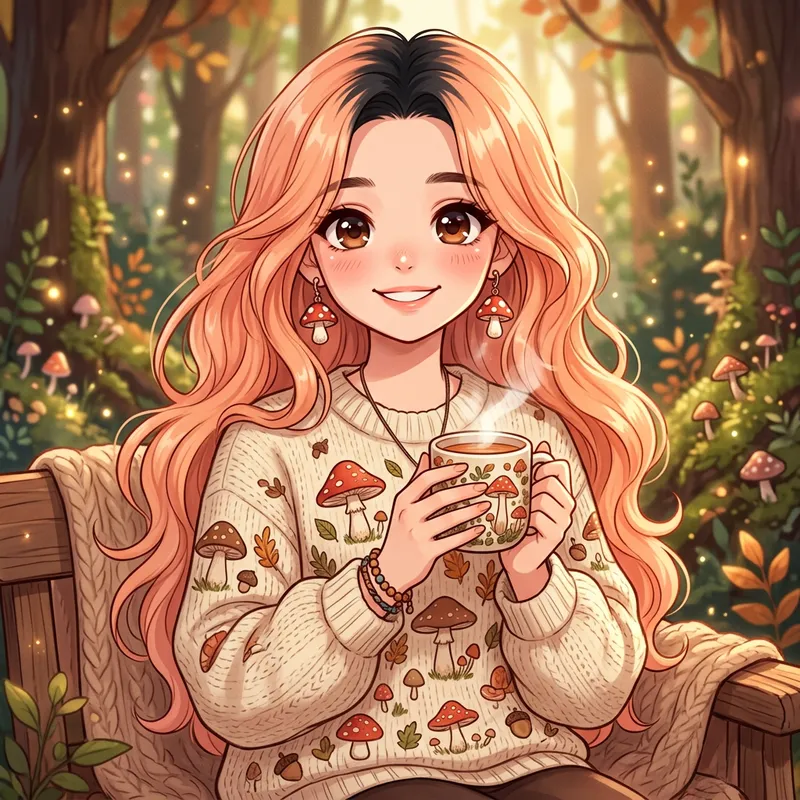 Create an image of a youthful anime character with long, pastel orange hair featuring dark roots and shining dark brown eyes. This character is dressed in a cozy, mushroom-patterned sweater and is accessorized with whimsical mushroom-shaped earrings.
