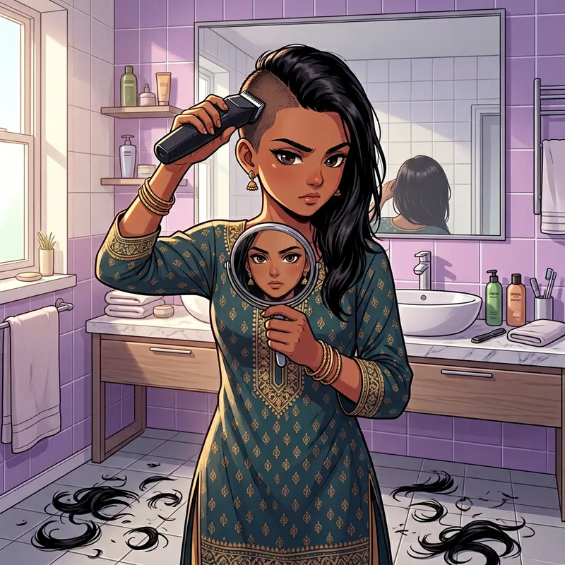 A South Asian girl in the style of anime is shaving her own head. She is holding a handheld mirror in her left hand, watching her progress critically. In her right hand, she tightly grips an electric hair shaver. A determined look fills her eyes, demonstrating courage and acceptance of the significant change she's making. The scene is set in a brightly lit, modern bathroom fitted with appealing lavender tiles. Disconnected strands of her previously long, black hair lay sporadically scattered on the floor. The girl's traditional attire, perhaps a Salwar Kameez or Sari, forms an interesting contrast to the modern surroundings, the electrical hair shaver, and her bold decision.