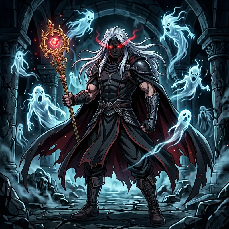 An anime-styled male figure with a muscular build and long white hair stands as the main figure of the scene. His facial expression is stern and intense with a hint of anger, brought to life by the dramatic lighting that casts mysterious shadows on his visage. His piercing red eyes emit a chilling aura, matching the cool hues that dominate the scene. He holds a golden staff elegantly designed with intricate details. Around him, eerie ghost-like figures hover, setting a haunting and atmospheric backdrop. This high-resolution artwork highlights every detail of his design, from his determined gaze to his powerful stance, all contributing to a captivating portrait of strength in the darkness. The scene is rich with anime stylistic cues while retaining a unique touch, making for a truly alluring and impactful composition.