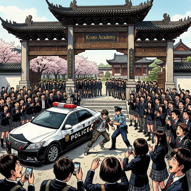 A police car parked in front of the grand entrance of the prestigious Asian noble school, surrounded by a crowd of excited students eagerly watching a thrilling anime-inspired scene unfold. Captured with a cinematic flair, this photograph showcases vibrant colors, reminiscent of comic book illustrations. The students are depicted with animated expressions of awe and anticipation, adding an energetic atmosphere to the composition. Shot with a wide-angle lens, the image captures the full scope of the scene, highlighting both the majestic school gate and the police car in the foreground. This photograph combines elements of anime style, with its bold outlines and vibrant hues, and documentary-style photography, creating a unique fusion of genres.