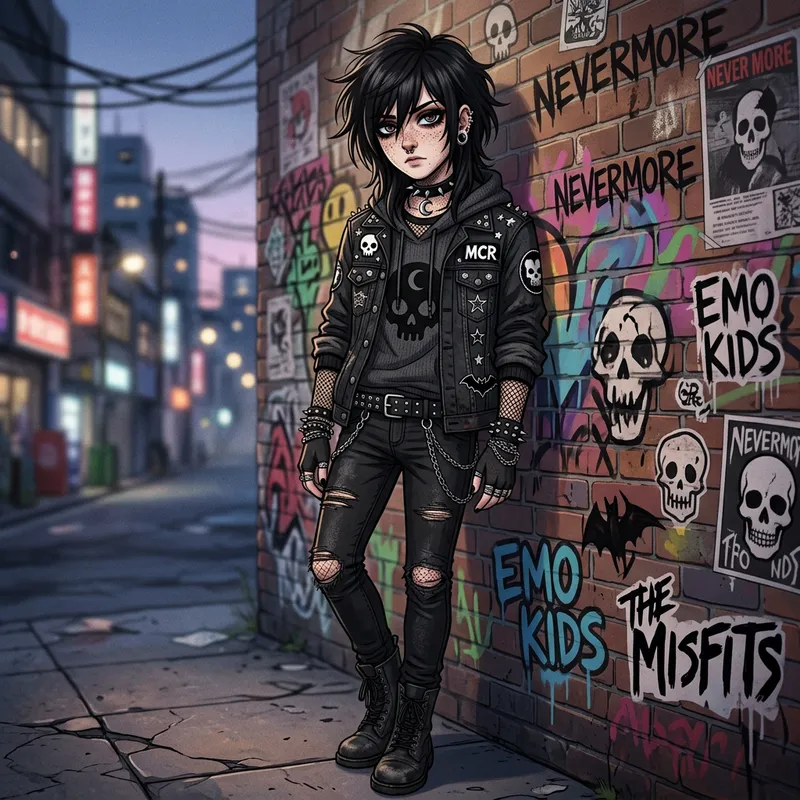 An anime-style character featuring pale skin adorned with numerous freckles. They have shoulder-length black hair and captivating dark brown eyes, distinguished by a unique pale blue ring around the pupil. They are dressed in an emo attire, characterized by dark colors and layered fashion elements.