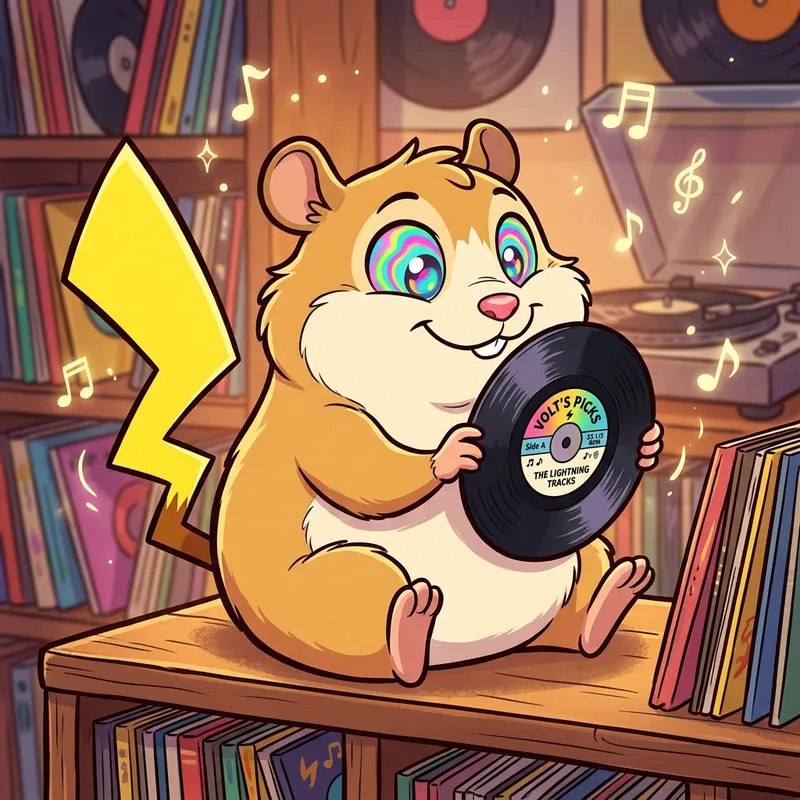 A creature resembling a small, plump rodent with a tail shaped like a lightning bolt. The creature exhibits traits akin to a caricature with anime influence, focusing on its face and hands which are delicately holding a vinyl record. Its eyes are vibrant with psychedelic colors, embodying its lively expression. The artwork is a digital illustration defined by bold outlines and flat colors, reflecting traditional animation aesthetics. Musical notes are added subtlety into the scene, floating around the creature, for an ambience of music-inspired theme.