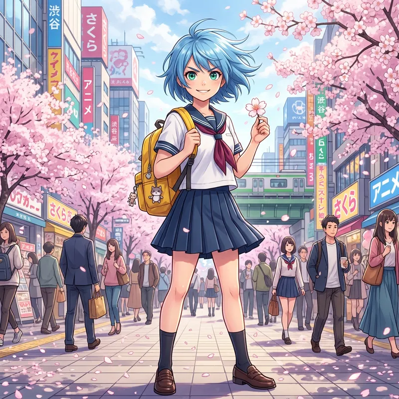 Create an image of an anime-style character. This character is a young female with deep emerald green eyes that sparkle with determination. She has short, spiky hair that is dyed a bright shade of sky blue. She is dressed in a traditional school uniform, complete with a white blouse, deep maroon necktie, and navy-blue pleated skirt. She carries a yellow backpack over one shoulder. In her other hand, she holds a single sakura blossom. The backdrop of the image is a bustling cityscape with tall buildings, people bustling around, and cherry blossom trees in full bloom.