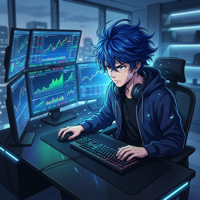 An anime-styled man with swirling blue hair is depicted seated at a sleek, modern trading desk. His eyes intensely fixed on the multiple monitor setup in front of him, which glow with vibrant graphics of fluctuating economic indices. This dedicated trader, represented in striking colors and exaggerated vibrant visuals typical to anime, fully engrossed in the process of tracking and trading indices.