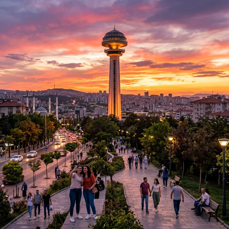 View of Atakule in Ankara, Turkey during a vibrant sunset. The sky is painted with hues of orange and pink as the sun sets behind the structure, casting long shadows on the surrounding area. Golden light illuminates the tower, creating an enchanting spectacle. The scene is serene, with calm roads and sidewalks. People of various descents and gender are seen scattered, enjoying the mesmerizing view of the iconic landmark and taking leisurely strolls. The majestic architecture of the tower stands tall against the backdrop of the beautiful evening sky, adding an impressive aesthetic to the overall view.