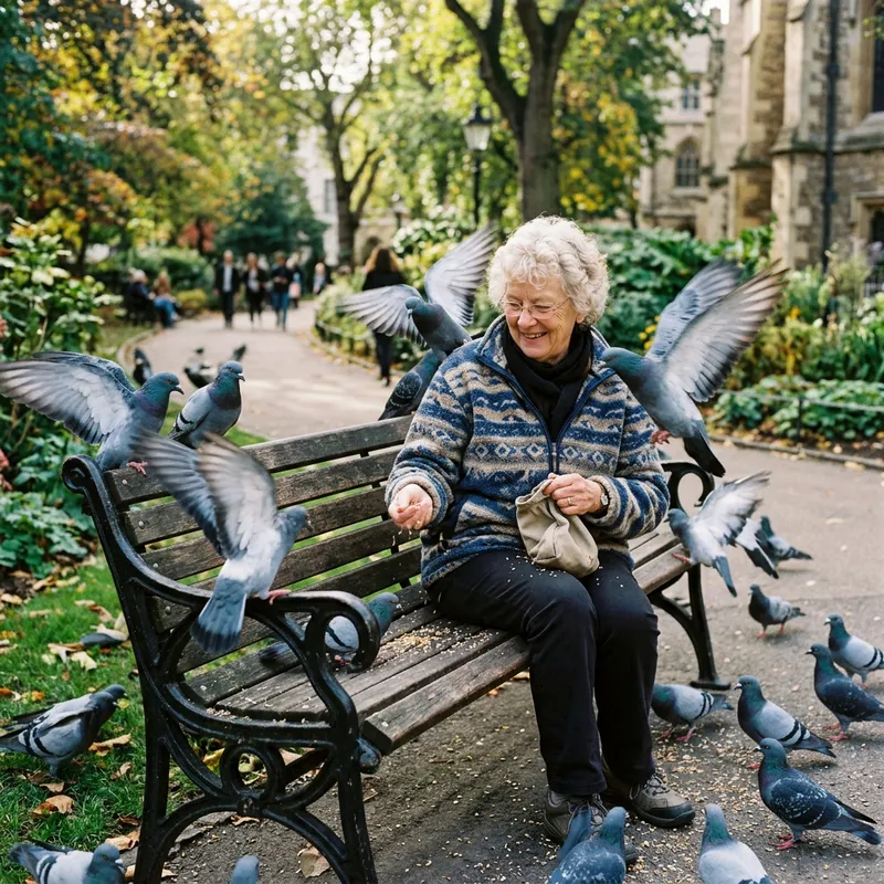 An elderly Caucasian woman, possibly in her 70s, with a kind smile is sitting on a park bench with various pigeons fluttering around her.