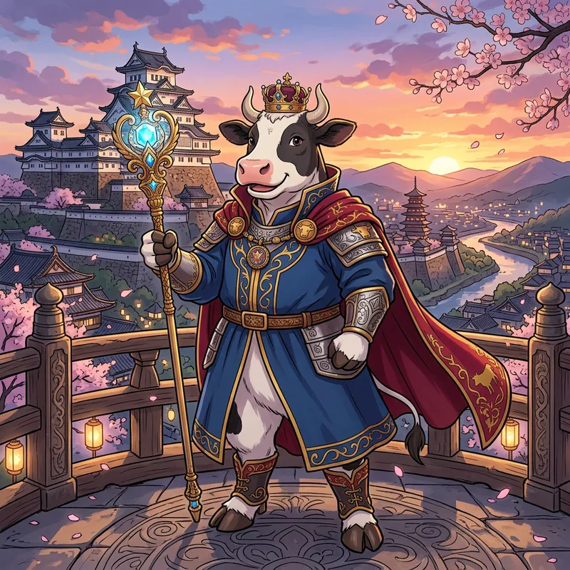 An anthropomorphic cow standing on two legs, holding a scepter in its paw, designed in the style of animated Japanese Art