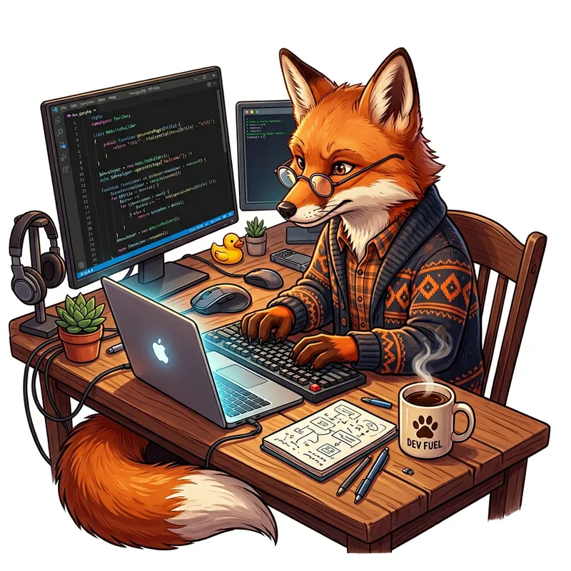Create an image of a fox, anthropomorphized and sat at a desk, deeply engrossed in web development. It's working on a computer with lines of PHP code visible on the screen. The fox has spectacles on its nose, and there's a hot cup of coffee nearby. This should be a detailed and colourful PNG image with no background.