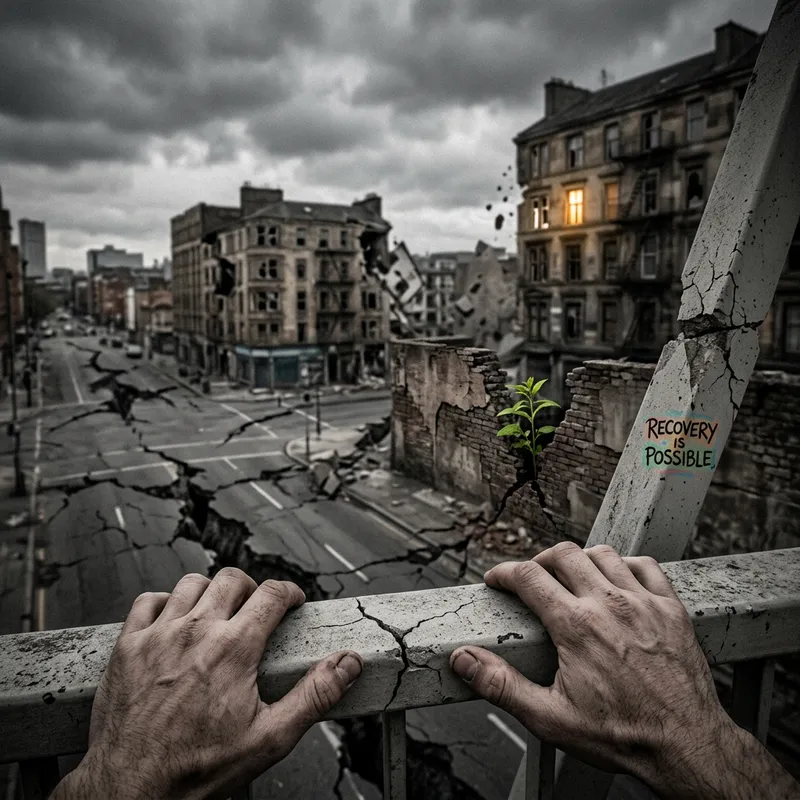 A powerful image for anti-drug awareness that graphically depicts the devastating effects of addiction. The earth is perceived to be crumbling, shattering, and dissolving under a gloomy, overcast sky, symbolizing the destruction and chaos addiction brings about. The viewpoint is seen through the eyes of a person struggling with substance abuse- their world, once vibrant and full, is now fractured, dilapidated and losing color. The environment seems to quake and crack, a mirror of their internal turmoil. Small fragments of hope remain, glowing with a weak but unyielding light, a strong visual cue for the possibility of recovery.