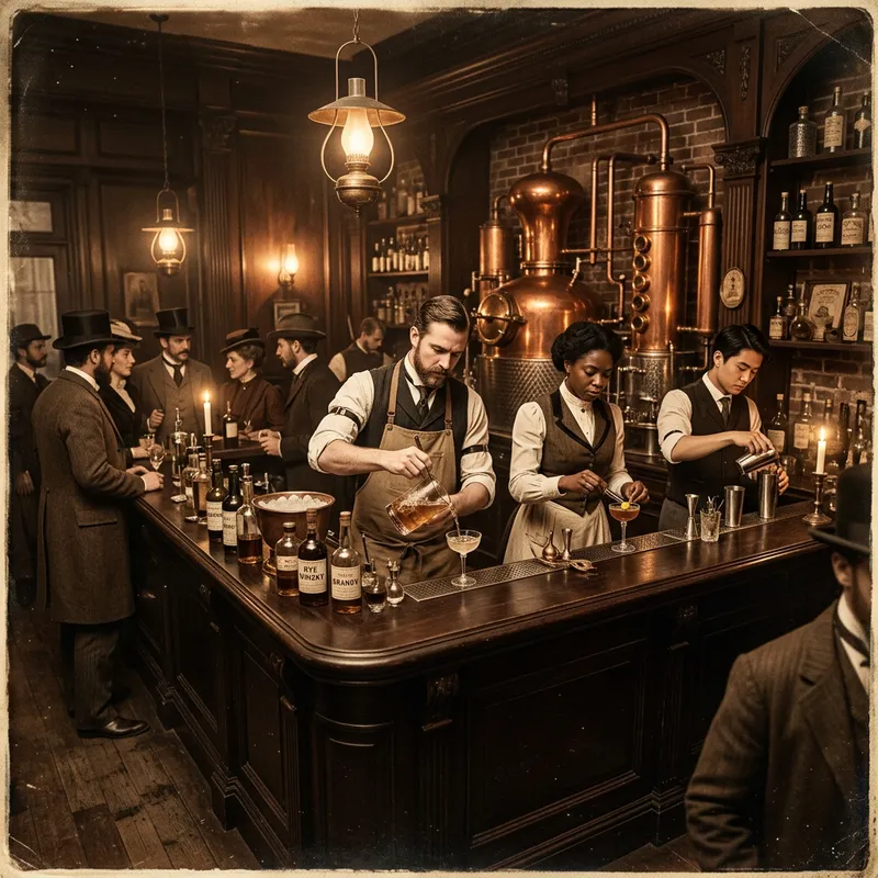 Depict an antique cocktail bar in the 1800s, showcasing the elegance and ambience of the era. The scene should be infused with warm sepia tones and dim, cozy lighting, reminiscent of aged photographs. Visualize bartenders of different genders and descents, meticulously preparing concoctions with period-appropriate glassware and tools. Incorporate antique copper distillery equipment as a backdrop for added authenticity. The entire visualization should be captured with the essence of a large format camera, for an elevated, immersion of the viewer into this historical time-frame, celebrating the craft of age-old mixology.