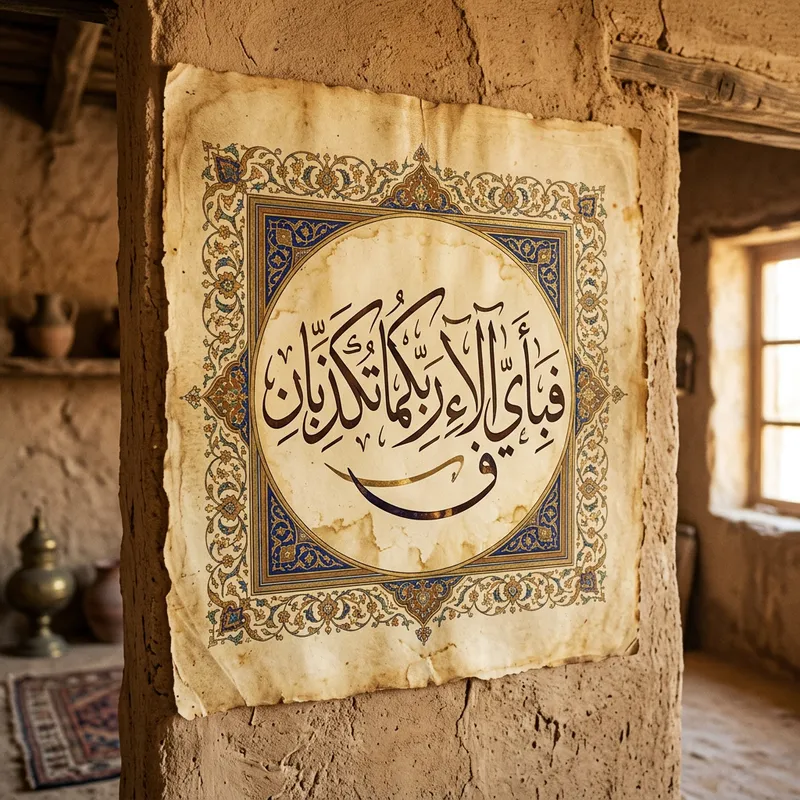 Visualize an antique, Arabic calligraphic representation of the verse 'Then which of the favors of your Lord will you deny?' from the Quran. This should be portrayed on a vintage, parchment paper, making use of traditional ink, and styled with the intricate curves and loops of classical Arabic calligraphy. Let's also see some ornamental designs and floral motifs around the border. Please ensure the background has an aged, warm tone, reminiscing the clay-baked mud walls of an old desert abode. The image should bring out the serene, meditative quality of the verse with an overall peaceful environment.