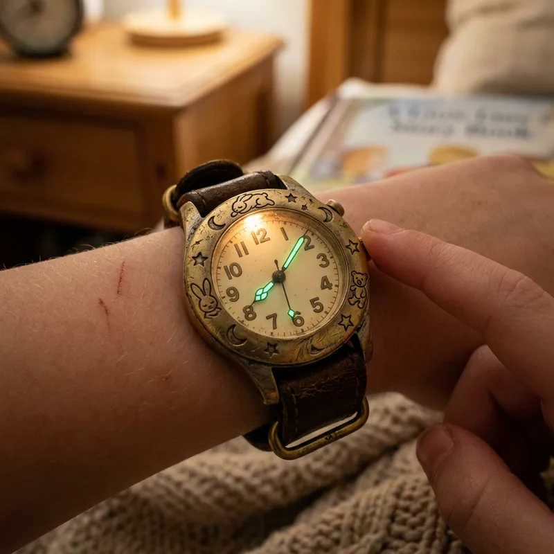 An antique watch designed for a child, equipped with a built-in light feature. The casing is subtly tinted with age, and small scratches are observable, indicating its ample use over the years. It is embellished with whimsical, kid-friendly details, such as carvings of animals or celestial bodies. The watch face is large and well lit for easy readability, even in darkness. The hands of the clock are luminescent under the soft glow of the built-in light. The presence of a sturdy, yet comfortable strap makes it ideal for a child's wrist.