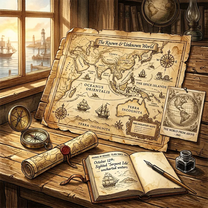 An antique style map resting on a wooden table. Intricate, well-aged, and slightly torn at the edges, the map is full of labels in gorgeous calligraphy. Sunlight pours onto the scene from a nearby window, casting an idyllic glow on a pair of brass compasses and a rolled parchment next to the map. An old-timey, sepia-toned photograph of the earth is pinned right beside the map. On the table, there's an ink pen and an explorer's notebook left open at a page detailing adventures in far-off lands. The illustration brings the beautiful nostalgia of exploration and discovery from the age of sailing.