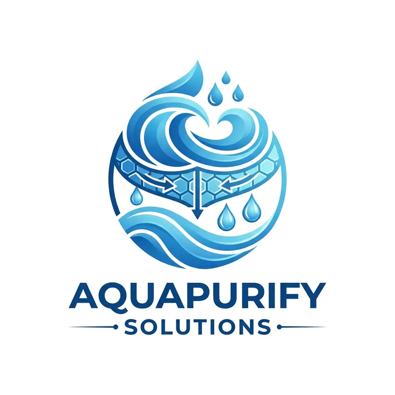 Design a company logo for a business named 'AQUAPURIFY SOLUTIONS'. The logo should feature blue color tones, and incorporate elements traditionally associated with water purification, such as clean water waves, purifying filters, and pristine water droplets.