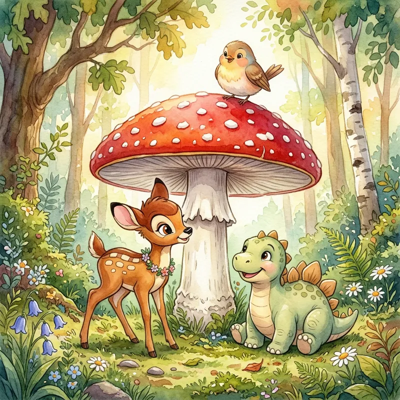 Watercolor painting in Disney style featuring a large fly agaric with a sweet round bird, a cute deer, and a chubby dinosaur.