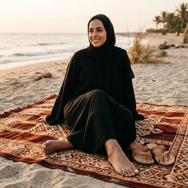 Arab women with abaya showing her feet, white nails, good looking, tanned skin, perfect anatomy, on a blanket.