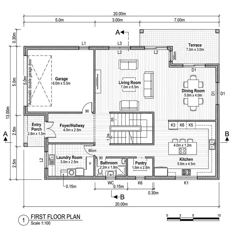Architectural 2D plan: The first floor of a house measuring 20 meters by 13 meters, featuring a living room, dining room, bathroom, kitchen, laundry room, and garage.