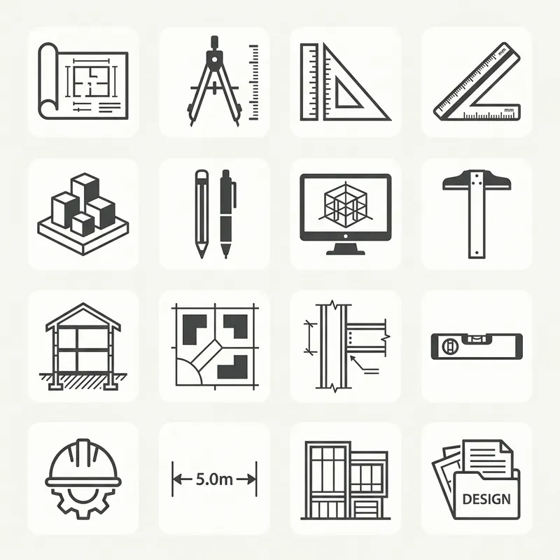 A visual representation of icons related to architectural structure design. The icons could include symbols representing architectural tools such as blueprint rolls, compass, rulers, and model buildings. They should be evenly spaced and designed in a monochrome color palette for a universal design language.