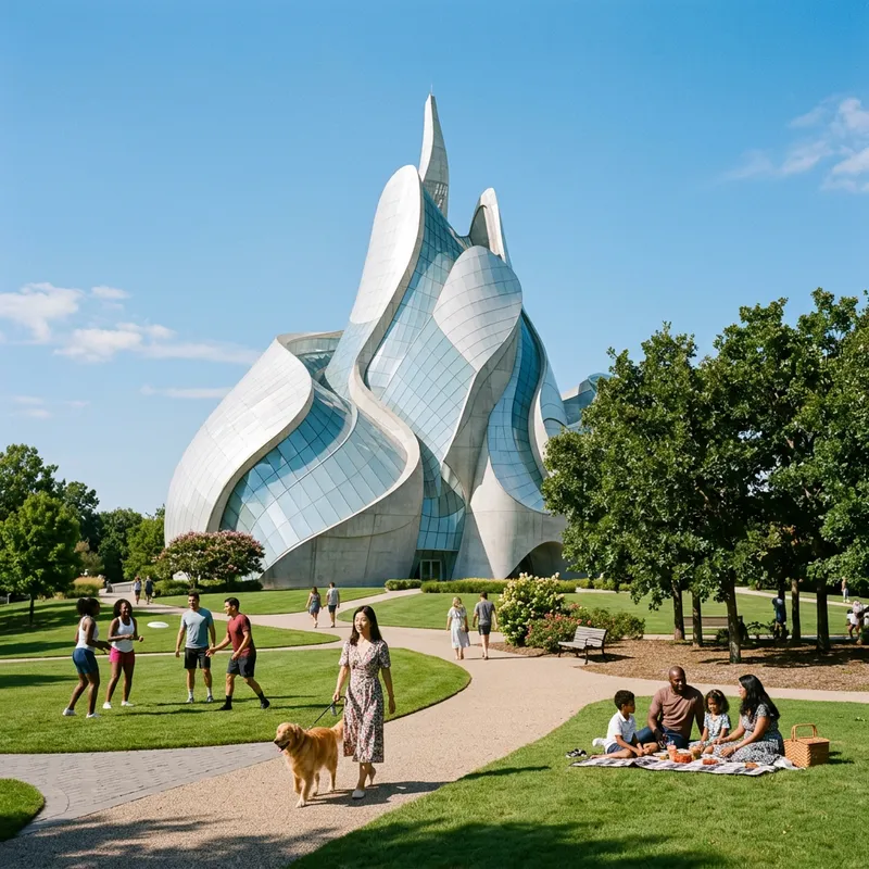 Create an image of an architecturally distinctive building in an odd shape. The building could take surprising forms such as resembling a fruit, a shell, or a geometrical shape like a cube or pyramid. The building is set against a clear blue sky in the daytime with a well-manicured park around it. There may be people of various descents and genders walking around the park, engaging in typical park activities like walking their dogs, playing Frisbee, or picnicking.