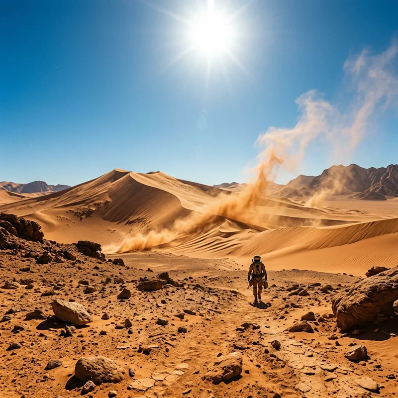 Depict the arid planet with predominately desert landscape featuring rocky plains and towering sand dunes. The sky is devoid of clouds, the sun harshly shines above, and the wind occasionally lifts clouds of sand into the air.