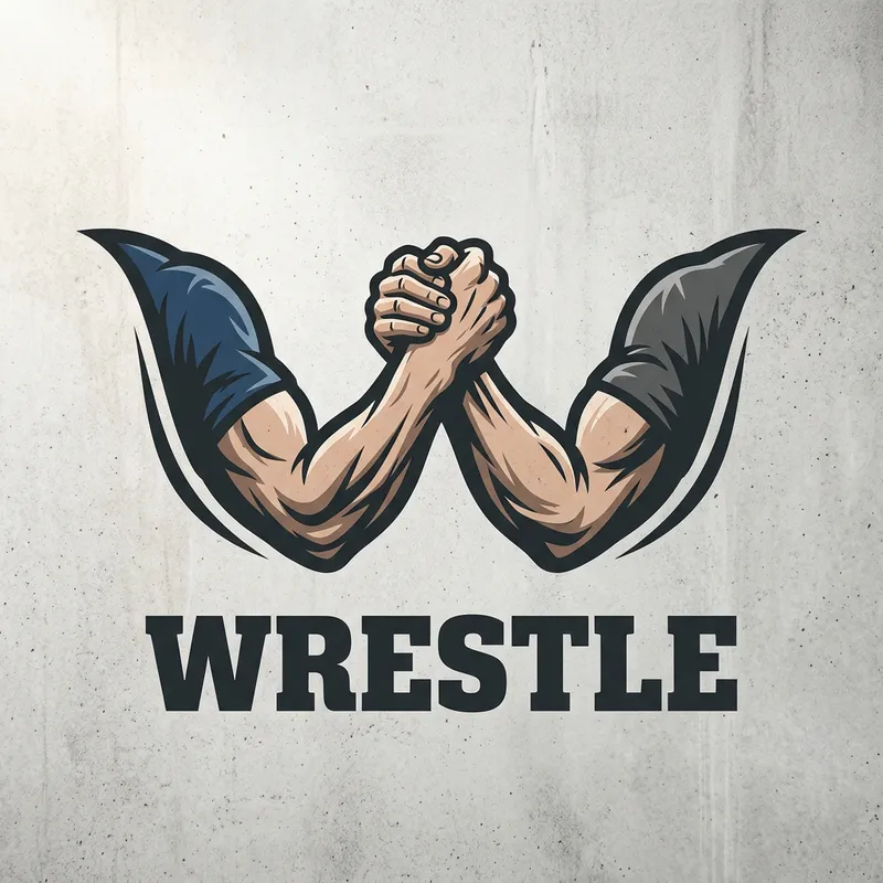 Creatively design a logotype with the initial letter 'W'. Imagine this unique 'W' to be artfully molded from two engaging arms in an arm wrestling match. Each appendage should curve smoothly to contribute to the overall shape of the 'W', while still maintaining the visual impression of a tussle of strength. Both hands should be portrayed mid-grapple in the classic arm-wrestling clasp, representing the meeting point of the letter 'W'. The font should be bold and impactful, indicating strength and competitiveness.