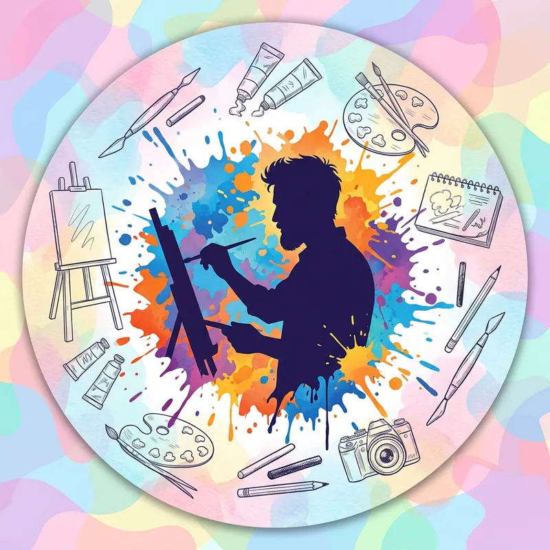 Imagine a profile photo for an art community. The image features a vibrant palette to emphasize the creative nature of the community. There's the silhouette of an artist, a Caucasian male, with a brush in hand shown within a drop of splattered paint. Surrounding that are sketches of a variety of art tools like easels, paints, and sketchbooks, symbolizing the different art forms practiced. The background is made of overlapping, soft pastel color patches, creating an abstract pattern that invokes a sense of creativity and imagination.
