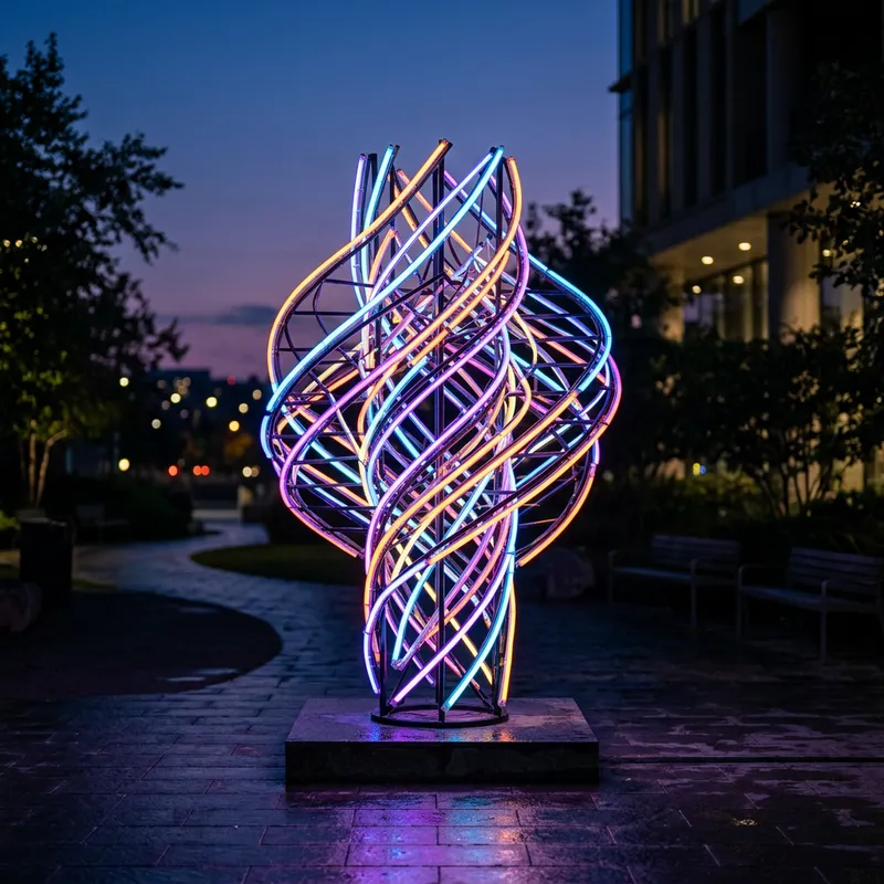 Create an artistic structure of 1.5m-hight LED tubes. The structure should be brilliantly illuminated, with the tubes arranged in an intricate design that showcases their glowing vibrancy. The scene should be captured at dusk, with a subtle play of lights in the background that aid in highlighting the brilliance of the LED tubes. The surrounding area should be quiet with minimal distractions, allowing the focus to remain on the glowing LED tube structure.