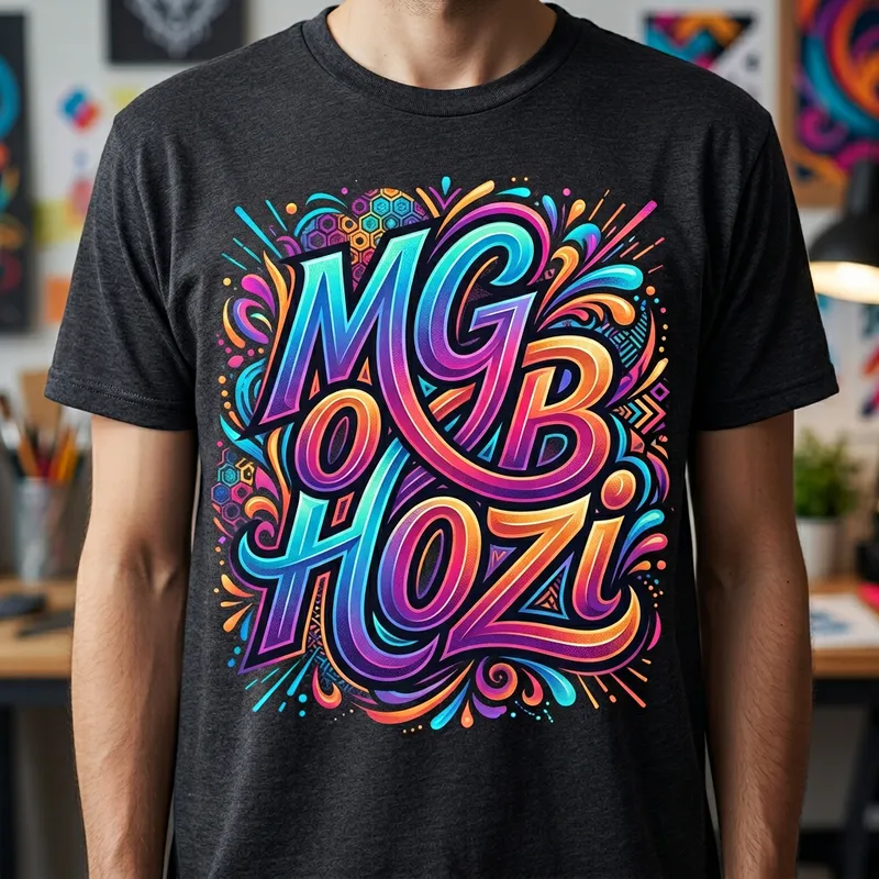Create an image based on a graphic design concept featuring the letters 'M, G, O, B, H, O, Z, and I' intertwined in an artistic manner. Feel free to add abstract shapes, gradients, and patterns around the letters to enhance the overall visual appeal. The design should be balanced, vibrant, and eye-catching, suitable for printing onto a t-shirt. Ensure the composition is aesthetically pleasing while abiding by principles of graphic design.