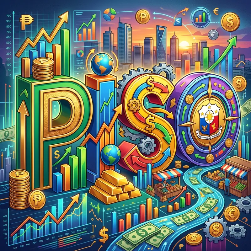Artistic typography design of the word 'Piso' using bold, colorful 3D letters related to economics.