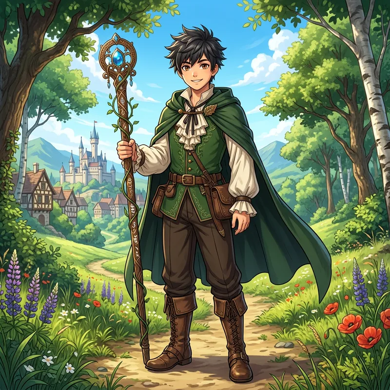 A young man of Asian descent, clothed in traditional European fantasy fashion. The style of his attire is reminiscent of a storyteller from a European fairy tale, featuring a ruffled shirt, fitted breeches, and tall leather boots. He holds an antique, ornate staff as he stands in a picturesque landscape of lush trees and a clear, bright sky. His anime-style eyes, spiked hair, and youthful features add an element of fantasy animation to this cross cultural scene.