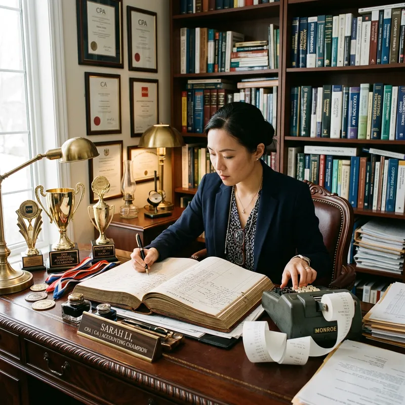 Imagine a scenario depicting an accounting champion. This individual, an Asian female, is skillfully handling a large old-fashioned ledger book filled with numbers. She is seated at a mahogany desk, immersed in her work, her fingers flying over an adding machine. Around her, there are shelves overflowing with books on accounting principles, taxation laws, and business management. On the desk, there are qualified certificates, gold trophies, and medals that stand testament to her knowledge and expertise in the field of accounting. The room exudes an atmosphere of knowledge, precision, and dedication.