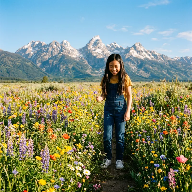 A young Asian girl, with long, straight, black hair, dressed in casual clothes. She is standing in a sun-drenched field filled with a myriad of radiant, colorful wildflowers. The sun is high in the sky, casting warm light that complements the vibrant colors of the petals. She has a gentle, joyous smile on her face as she admires the beauty around her. Behind her, a majestic mountain range sprawls under the azure sky, enhancing the serenity of the scene.