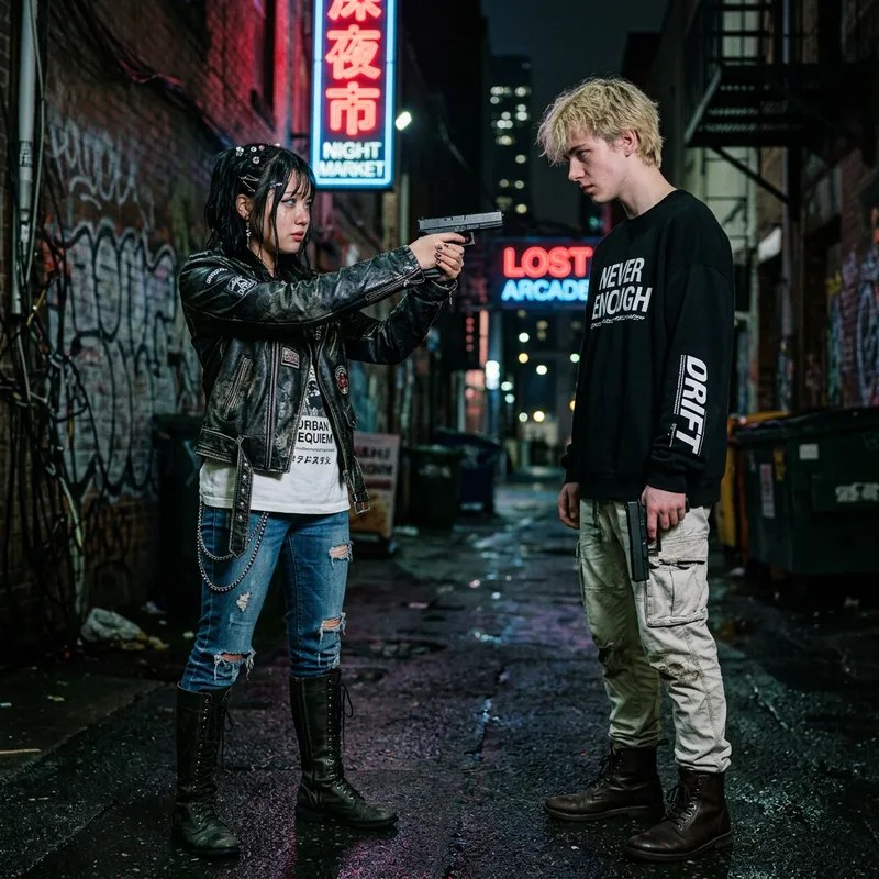 Night scene, two people. A teenage girl of Asian descent standing sideways, an idol with black hair, hair decorations, makeup, and blue eyes. She's wearing a stylish costume consisting of a short black leather jacket with long sleeves and many pockets, a white t-shirt with inscriptions, blue jeans with chains, and tall black boots. She's holding a gun and her gaze is aimed at a boy with a serious look and tears in her eyes. A Caucasian teenage boy with blonde hair and green eyes, he's wearing a black sweatshirt with long sleeves and inscriptions, light-colored trousers, and brown boots. He's standing sideways, gun in hand, looking at the girl with a submissive and tired gaze.