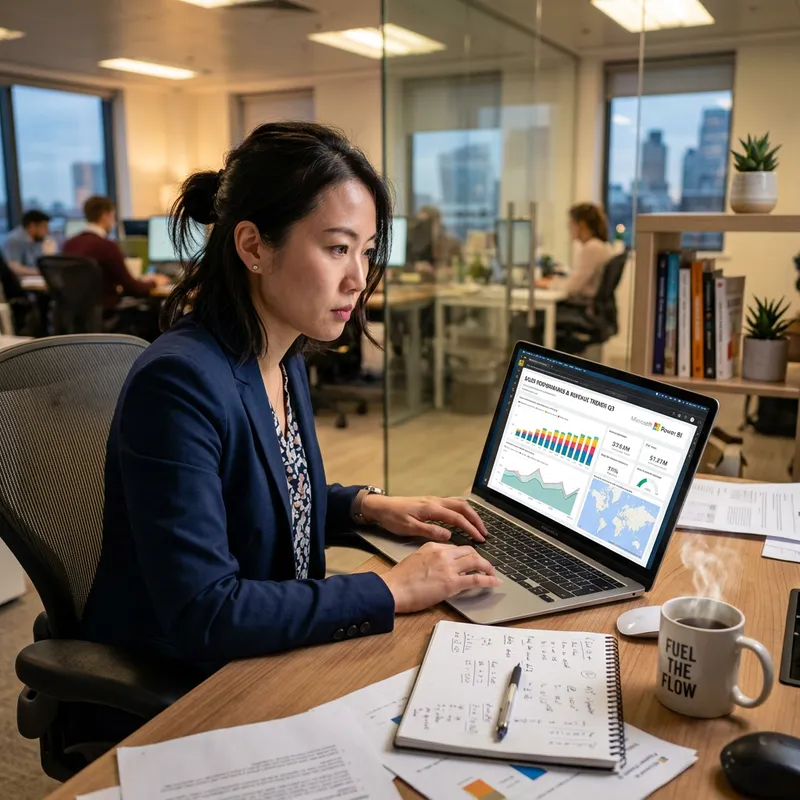 An Asian woman focused on developing a Power BI dashboard on her laptop screen. She's sitting in a modern office with notes strewn across her desk, a mug of steaming coffee by her side. The vibrant charts and graphs of the dashboard are brightly highlighted on the laptop's screen. The intensity in her eyes reveal her dedication and attention to detail.