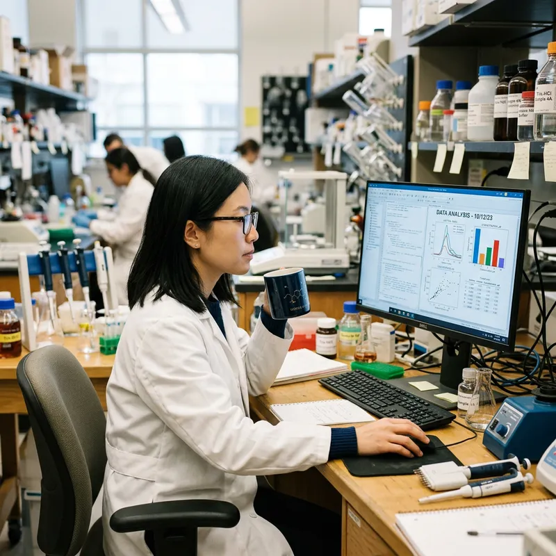 Draw a picture of an anonymous Asian woman, with straight, shoulder-length black hair, wearing glasses and a white lab coat, working in a scientific laboratory setting. She is diligently analyzing some data on her computer screen while holding a coffee mug in her other hand.