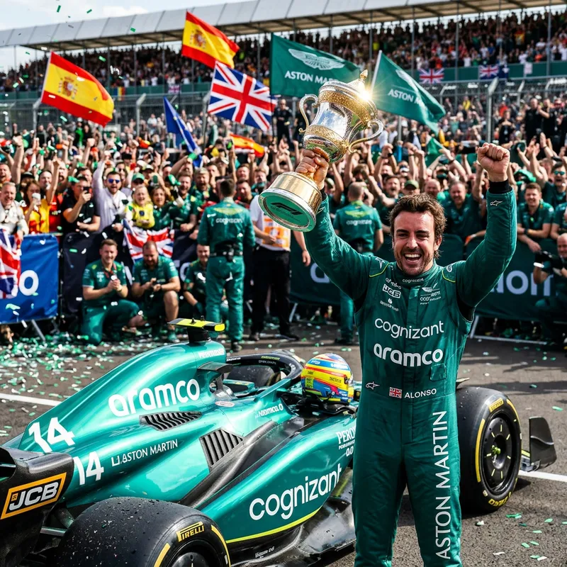 A vibrant green Aston Martin Formula 1 race car precision-engineered for speed and power. On the side, beside it, stands a jubilant male professional race car driver of European descent, his face filled with elation. He is hoisting high above his head a glistening World Cup trophy, its surface catching the sunlight. The crowd in the background is a blur of excitement, their cheers almost tangible. It is a moment of victory captured beautifully in a frozen instant.