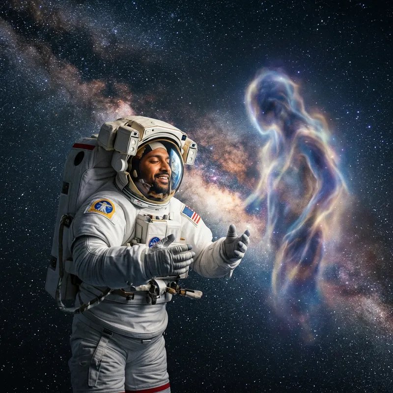 An image depicting a scene in deep space, with the Milky Way galaxy as the backdrop. In the foreground, an astronaut of South Asian descent in a detailed NASA spacesuit with the Earth reflected in the helmet's visor, floats weightlessly. He has a radiating expression on his face as if in awe or perhaps communicating with a divine entity. Next to the astronaut, a nebulous, intangible figure, radiating soft, ethereal light also appears. This figure could be interpreted as a representation of a universal god-like entity, devoid of any specific religious characteristics but with an air of tranquility, wisdom, and absolute power.